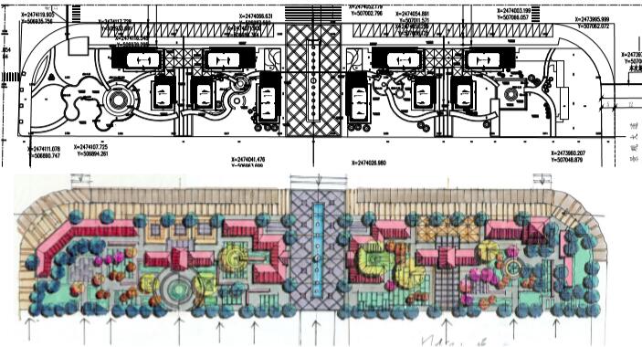 在設(shè)計(jì)地塊中心是一長條形的旱噴景觀,是游園主要的景觀節(jié)點(diǎn),達(dá)到吸引人群,增強(qiáng)空間氛圍,是休閑市民進(jìn)入商場的主要廊道。 地塊兩側(cè)分別設(shè)置三五處活動節(jié)點(diǎn),為前來游園的人提供開放、半私密、及私密空間,功能上有商業(yè)空間、 休閑空間、娛樂空間等,用自由的曲線道路把各個景觀節(jié)點(diǎn)有效得聯(lián)系起來。