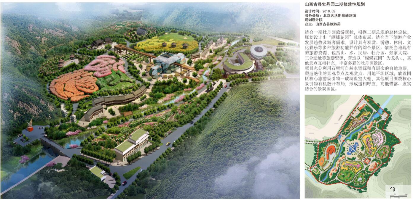 結(jié)合一期牡丹園旅游現(xiàn)狀,根據(jù)二期總規(guī)的總體定位.規(guī)劃設(shè)計(jì)出“蝴蝶花園”總體布局,結(jié)合當(dāng)下旅游產(chǎn)業(yè)發(fā)展趨勢及游客需求,設(shè)計(jì)具有觀賞,游憩,休閑,文化娛樂等多種旅游功能并存的綜合景區(qū)。依托當(dāng)?shù)噩F(xiàn)有的旅游資源,包括山、水、民居、牡丹園、張家人院、三合遺址等旅游資源。營造以“蝴蝶花園”為龍頭,其他景點(diǎn)互相補(bǔ)充,豐富多彩的牡丹園景區(qū)。