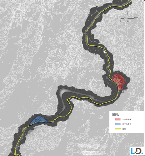 規(guī)劃用地范圍分為三部分:入口服務(wù)區(qū)、壺中天茶舍和貫穿全景區(qū)的道路。