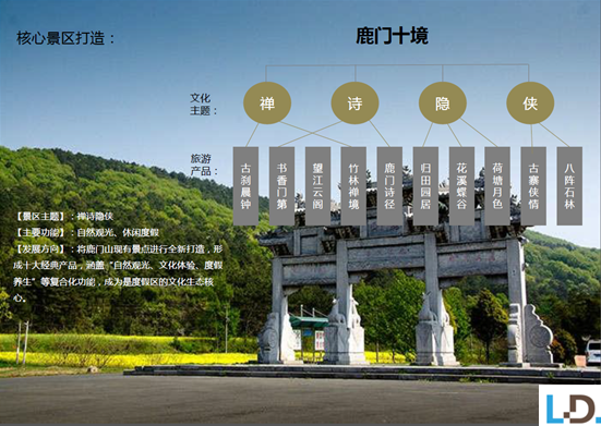 策劃思路:項目以隱逸文化為主題打造“鹿門十景”,形成景區(qū)旅游吸引力,二次激活鹿門山大眾旅游;開展“慢游鹿門”工程以休閑綠道建設,滿足專項市場需求,樹立景區(qū)形象;做大鹿門寺宗教旅游打造襄陽宗教旅游第一品牌;全面強化景區(qū)基礎設施建設,優(yōu)化景區(qū)旅游環(huán)境,打造 AAAA 級旅游景區(qū)。